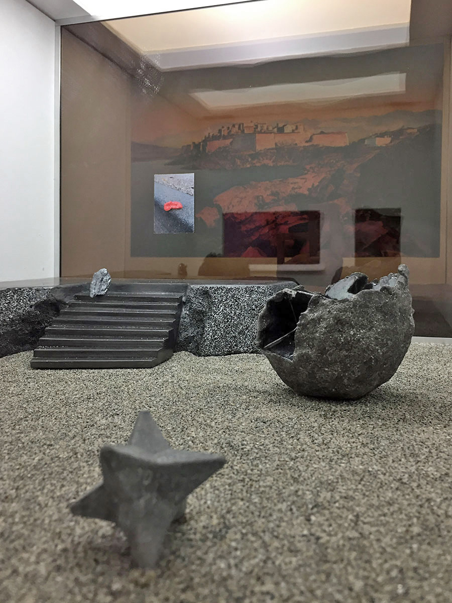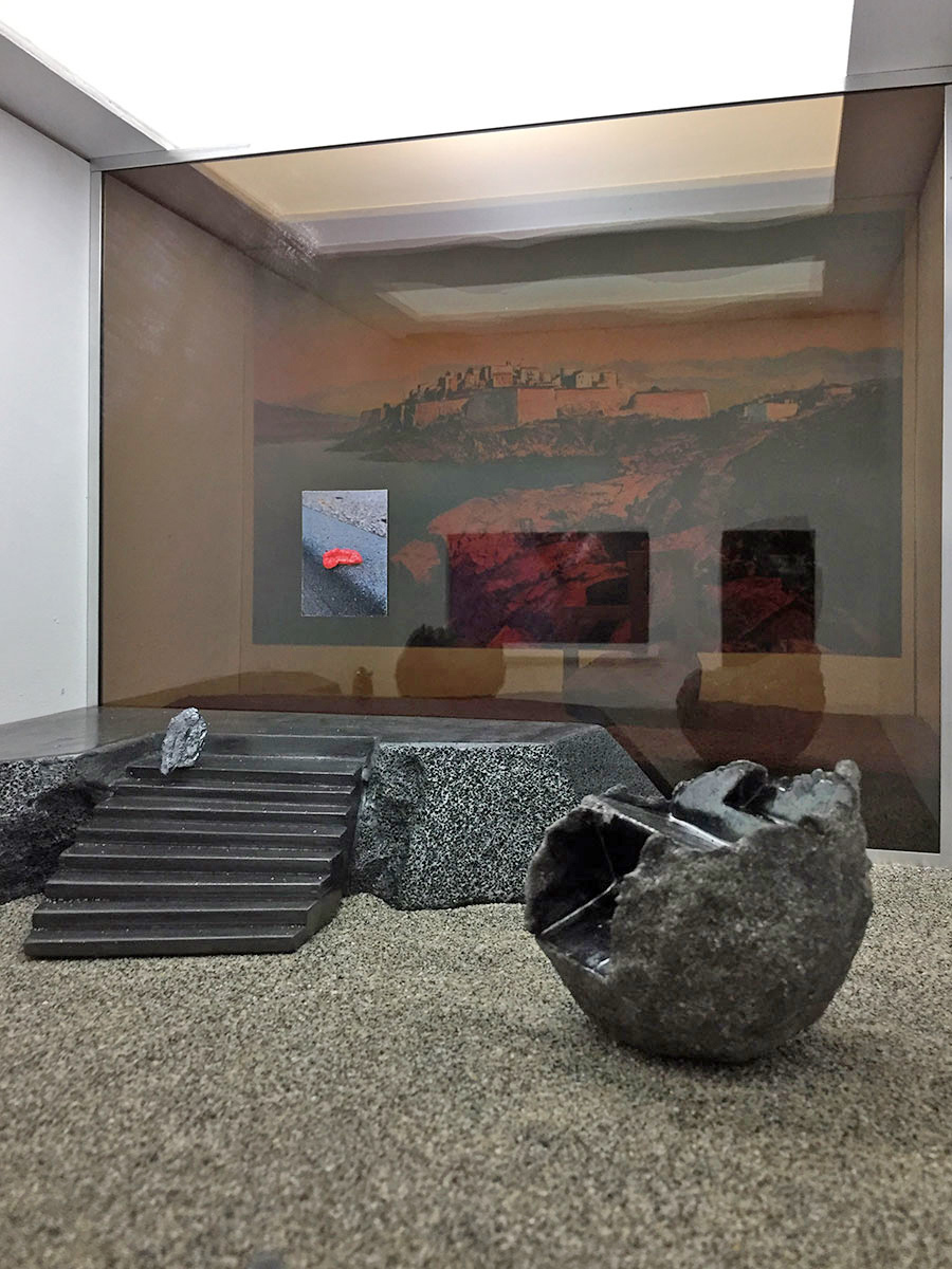 photographie, carte postale, céramique, plâtre, graphite, sable gris, sable rouge, silicium, plomb, vitre en verre, filtre gélatine sépia, profilés aluminium
